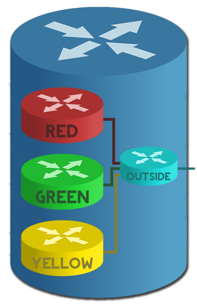 A useful analogy to think of this is using a house. The house’s front door is your FVRF, allowing people to enter or exit your house. Each room in your house is a VRF instance and anyone who enters through the front door can go to each of the rooms in the house if there is a door to allow you into that room.