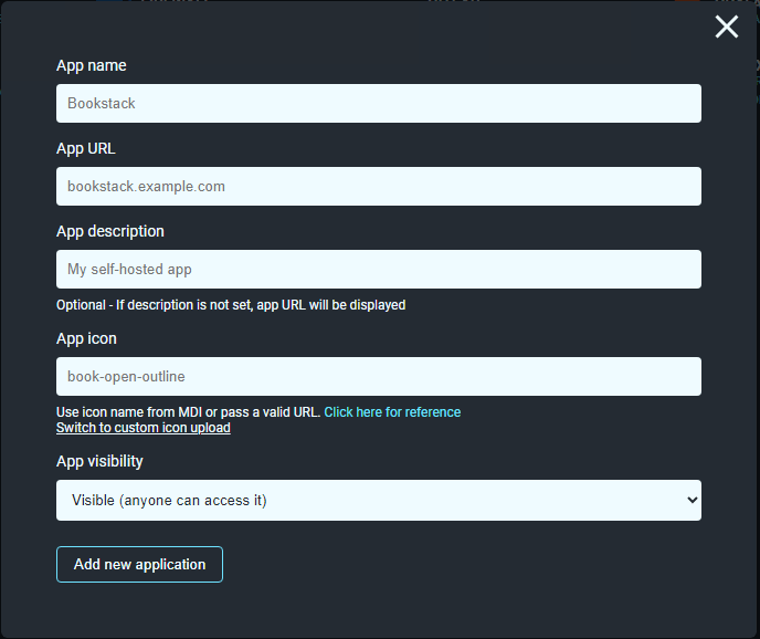 - Fill out the appropriate settings for the application you want to add and then click the ‘Add new application’ button.