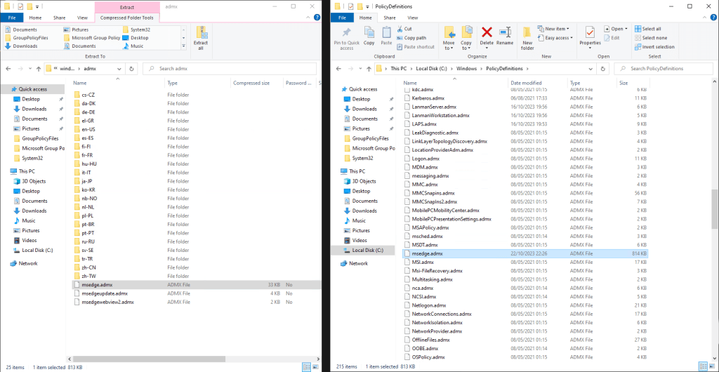 - Copy the ‘msedge.adml’ file from inside the appropriate language folder and then place it in the following directory: NOTE: Match the language folder name you have copied the file from.