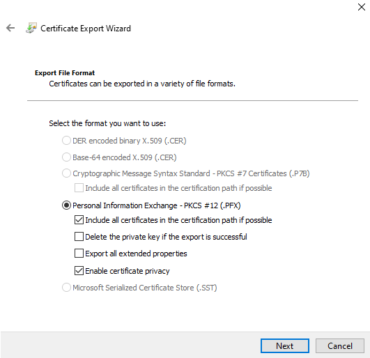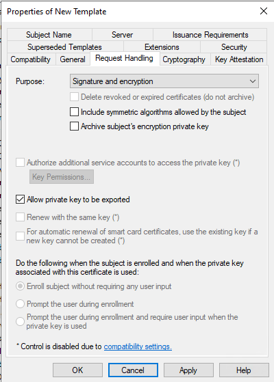 - Under the ‘Request Handling’ tab tick the ‘Allow private key to be exported’ checkbox.