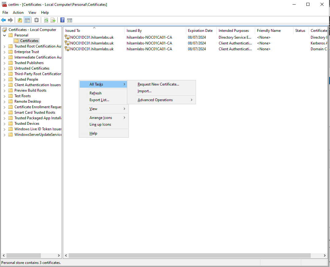 - Under the ‘Personal\Certificates’ folder right click and select ‘All Tasks > Request New Certificate’.
