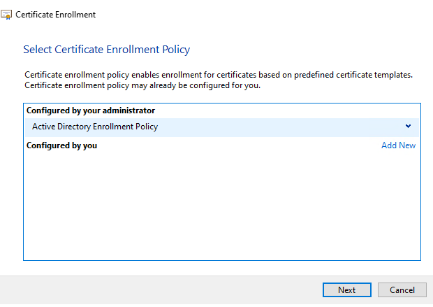 - Click ‘next’ on the ‘Certificate Enrollement Policy’.