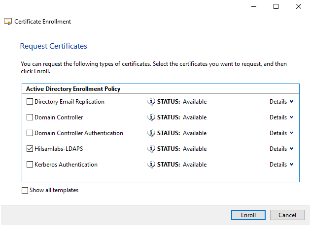 - From the list select the certificate template you created in Section II – A and then click ‘enroll’.