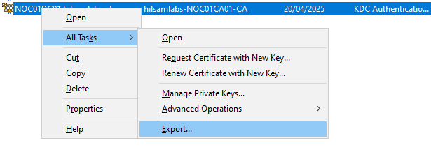 Now that we have our certificate in the DC listed under our ‘Personal\Certificates’ folder we need to export it so we can then import it into AD: