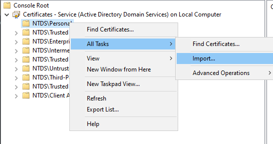 With our exported ‘.pfx’ certificate we can now import it into AD DS (Active Directory Domain Services):