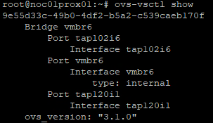 ovs-vsctl list bridge (bridge name - in my case: vmbr6)