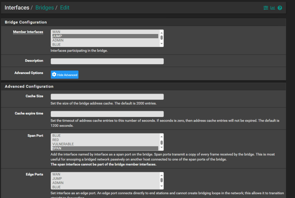 Now navigate to Interface > Assignments then select the ‘Bridges’ tab. Click the ‘add’ button to create a new bridge. Select the member interface you want to SPAN from and then under the advanced options select your new SPAN port as the destination for the SPAN. NOTE: if you want to SPAN mulitple interfaces make sure you create in individual bridge for each interface, so in my example I have a bridge per interface all destined to the same SPAN port.