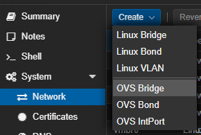 Navigate to your Proxmox server web GUI. Select your Proxmox node and then select ‘Network’ under the ‘System’ configuration. Click the ‘Create’ button and then select the ‘OVS Bridge’ button.