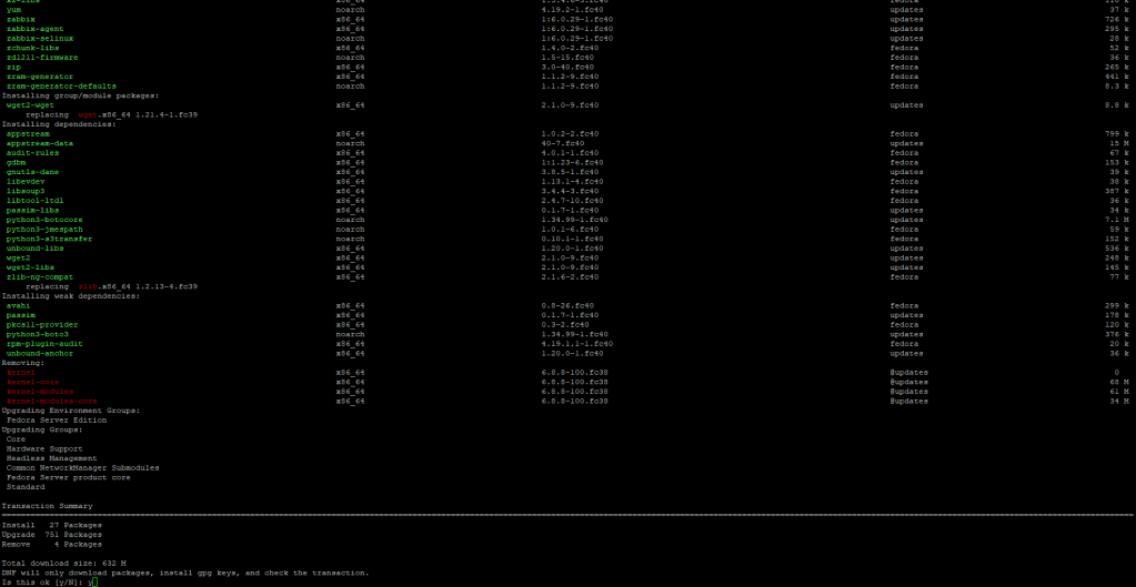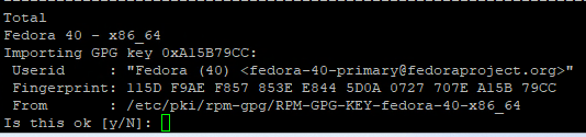 Enter ‘y’ when prompted because we have already been and made sure Fedora 39 is fully updated before starting the Fedora 40 download.