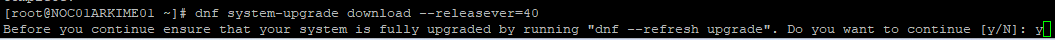 Enter ‘y’ when prompted because we have already been and made sure Fedora 39 is fully updated before starting the Fedora 40 download.