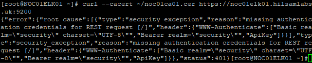Now I need to test the TLS certificates internally. In my case, I am running the Elasticsearch and Kibana services on the same machine. To test the TLS certificate internally from the machine where Kibana is running do a CURL to the Elasticsearch web API. Because I am using a custom Certificate Authority (CA) I am going to specify the CA certificate when I run the CURL command