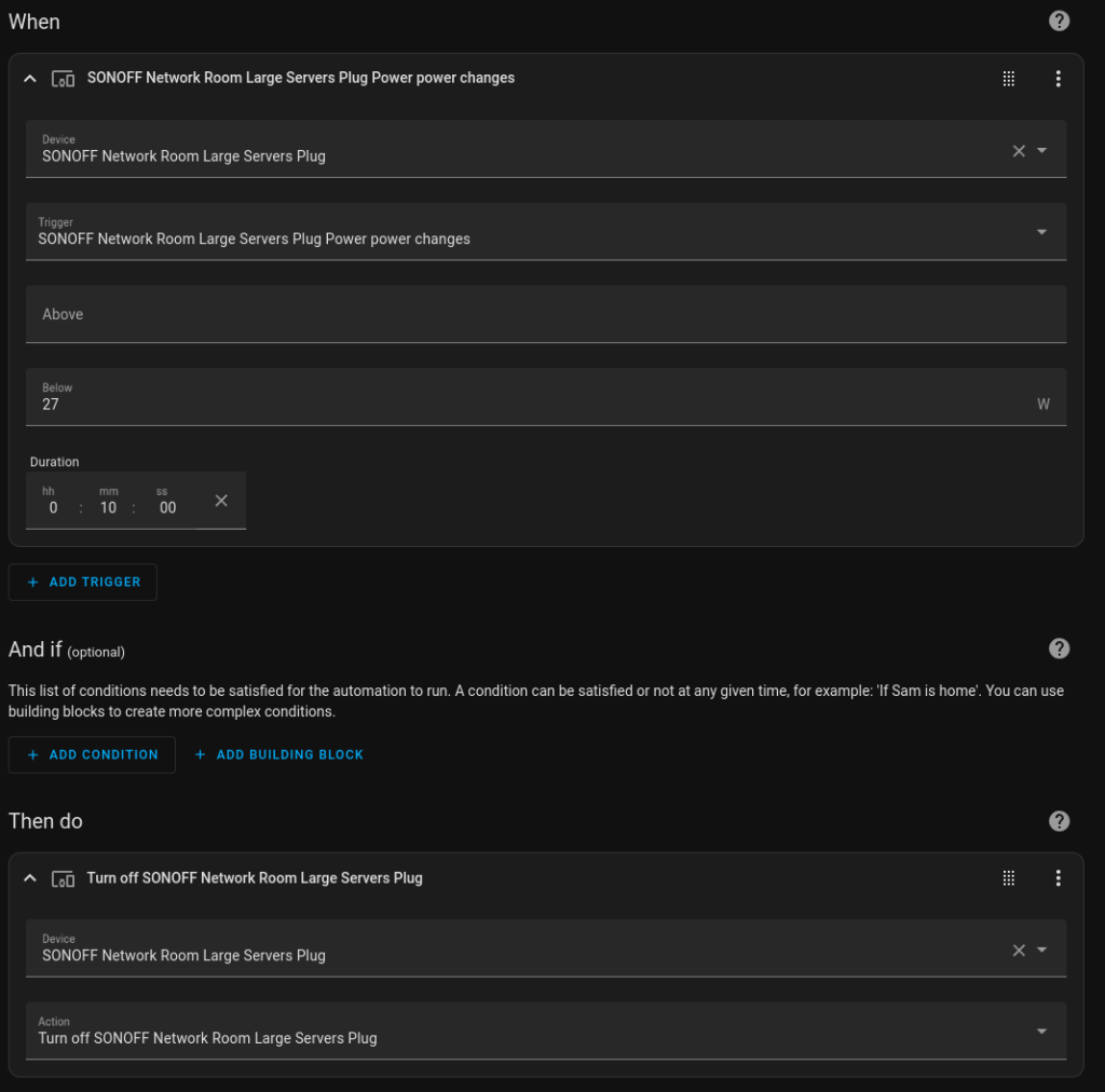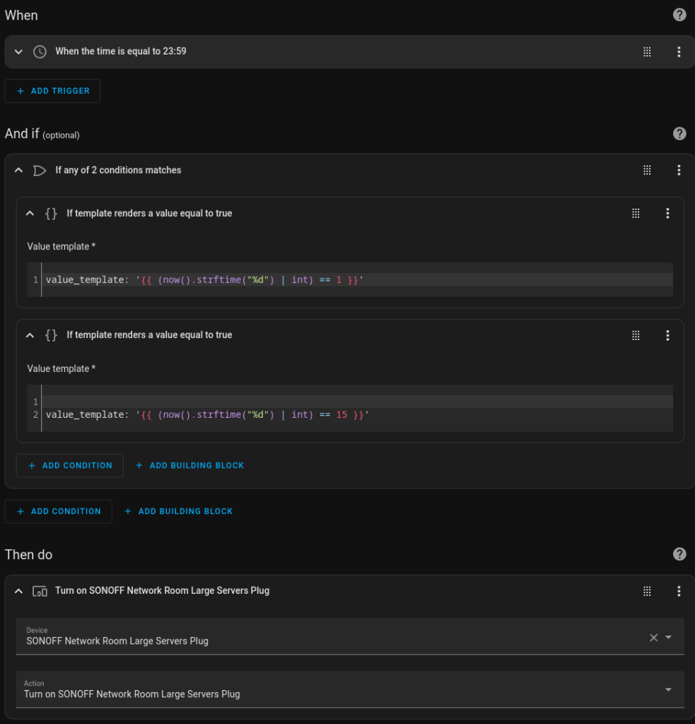 Firstly, I needed to set the BIOS on the backup server to power on upon power recovery. Next, I brought myself a smart plug so I could control the plug over my home network. Then, I connected the smart plug into Home Assistant via an existing integration. Finally, I configured automation on Home Assistant to run and power on the server at 2359 on the 1st and 15th of the month.