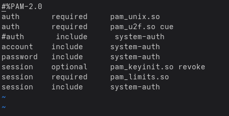 Find the pam_u2f.so line and change sufficient to required. Once you save the file this authentication configuration will immediately be in force.