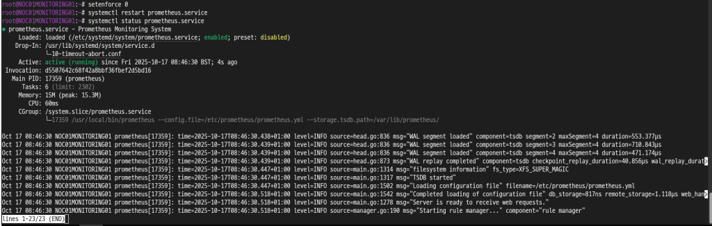 Then I switches SELinux back to enforcing and issues the following command and then restarted the Prometheus service: