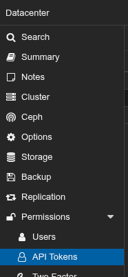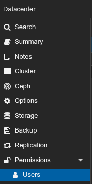 To create the user navigate to the Proxmox web Graphical User Interface (GUI) and then select Datacenter and under Permissions select Users.