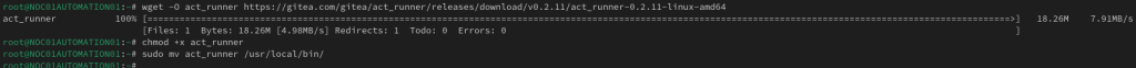 sudo -u act_runner act_runner register –no-interactive –instance http://<Gitea Server>:<port which is typically 3000> –token <YOUR_TOKEN> –name <runner name> –labels <runner labels>