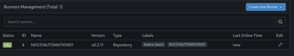 Now if you refresh your web GUI on the runners page for the repo you should see your runner listed.