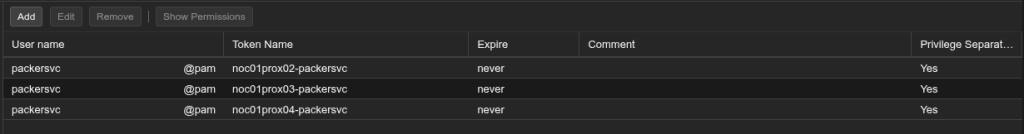 Select the Add button and create an Application Programmable Interface (API) token for the newly created Packer user. For my instance I have actually created an API token for each Proxmox node I have. NOTE: Make sure you securely save the API token secrets – Something I am not going to cover in this post is the setup of a Key Vault, you need to store the API tokens in a location that Packer will be able to securely retrieve them from in my case I use a HashiCorp Vault instance. You could equally use Secrets store within the Gitea Actions settings.