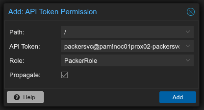 - Path – You can leave at ‘/’ for permission within the entire Datacenter or lock down to a specific Proxmox node