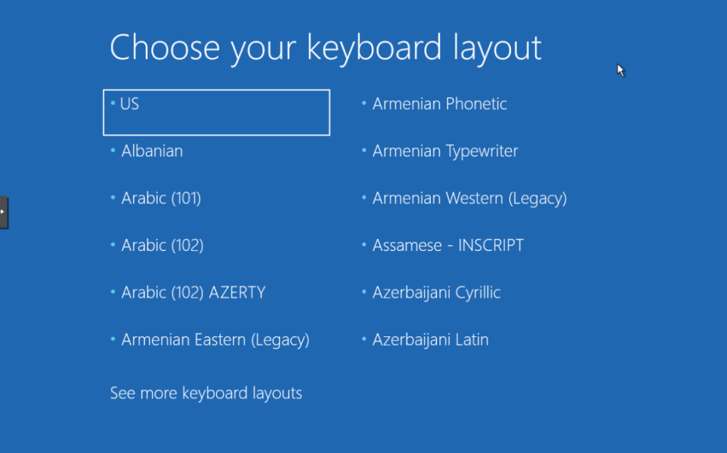 The natural first step when diagnosing/trying to fix a Windows Server that is in Recovery Mode is to select the appropriate keyboard layout and then select Troubleshoot -> Startup Repair: