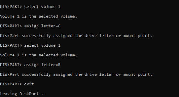 select volume 1 assign letter=C select volume 2 assign letter=B exit