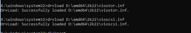 Back within Command Prompt enter the following commands to load the disk drivers, assuming the disk has mounted with the D drive letter: